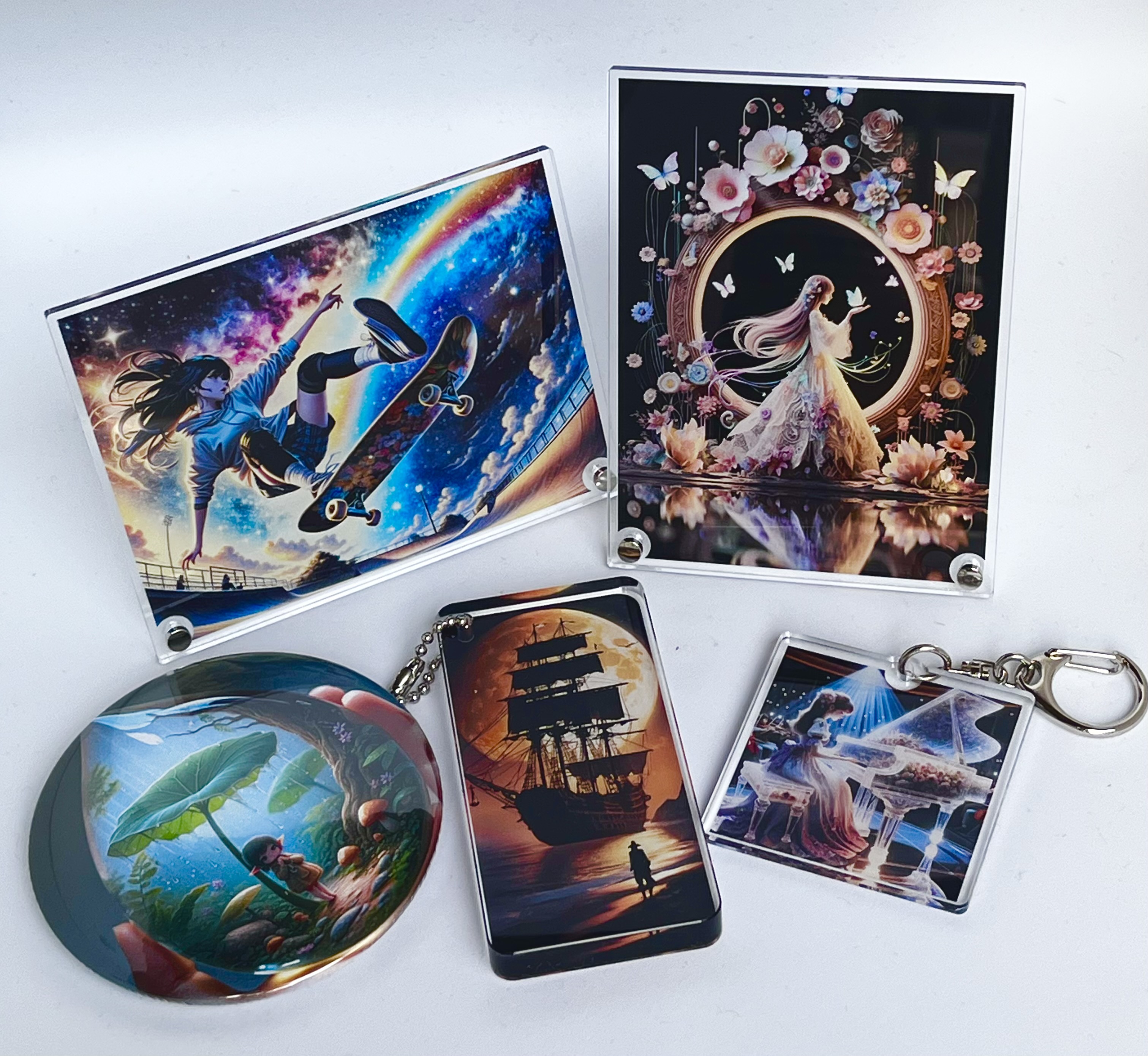 只今、当店のキャラクター「こまきちゃん」のキーホルダーや缶バッジアクリルスタンド等を制作しております。今後、ショップの方でも販売を計画しておりますので、よろしくお願い申し上げます。 尚、個人で生成したオリジナルAI生成作品で一部グッズ化も既に行っております。 | |